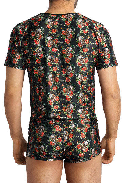Ce t-shirt sexy est fabriqué en Tissu doux imprimé de crânes et roses esprit Rock’n’Roll.